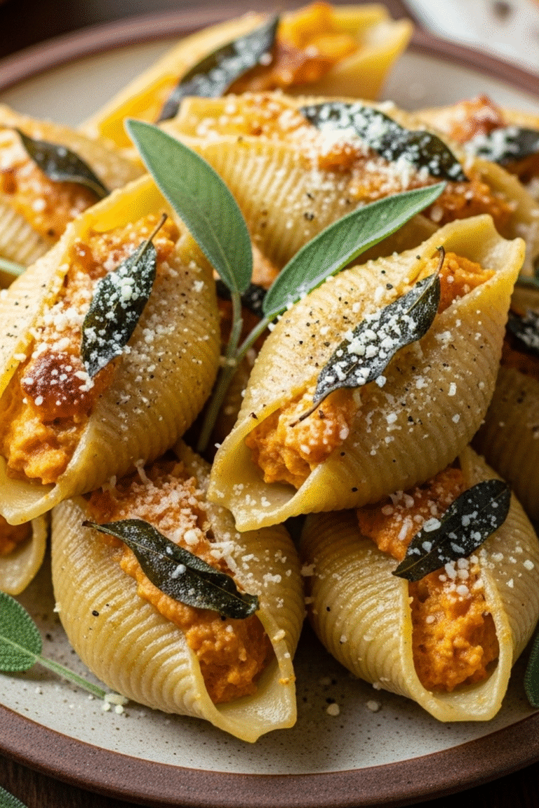 Serve these savory stuffed shells immediately, garnished with extra sage leaves and a sprinkle of Parmesan cheese for an elegant touch.