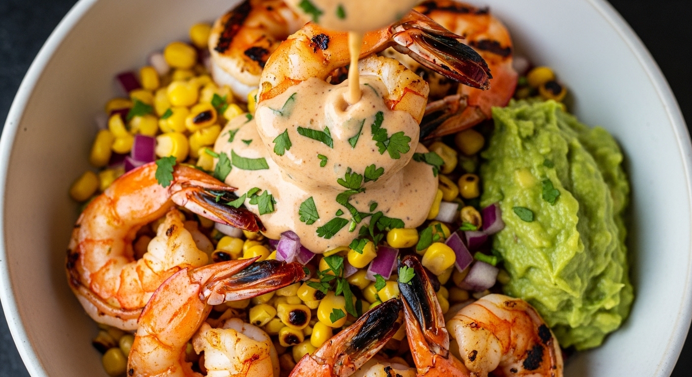 - Assemble the Bowls: Add rice, quinoa, or cauliflower rice as your base. Top with corn salsa, avocado mash, and grilled shrimp. Drizzle with creamy sauce and garnish with chopped cilantro.